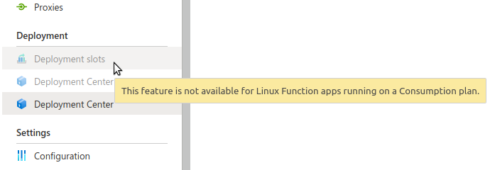 This was the first time EEE came back into my mind. Shortly thereafter, I stumbled over "stages" for Azure Functions. This is, again, a really thoughtful addition to the service which allows you to deploy your Function code directly into multiple deployment slots like "dev", "staging" and "production". The code in these instances can also be switched at will, f.e. you can test you changes and staging and swap this instance over to the production slot with the additional benefit that your application is already "hot", caches prewarmed etc. A great feature, right? Though luck, you cannot use it if you run your Function code in a serverless Linux environment. You can do so when running in a Windows environment, even when running on a fixed Linux instance, but not on Linux serverless (or "consumption", as they call it).