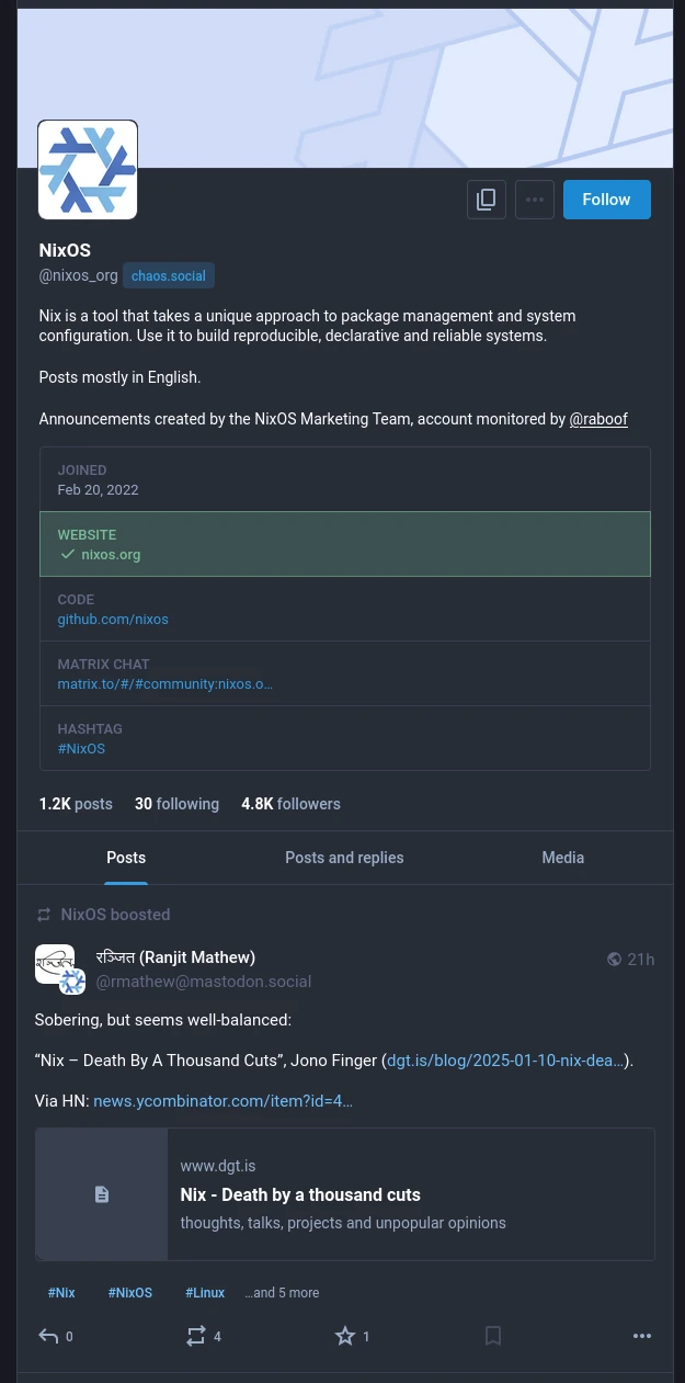 You can imagine how surprised I was when I saw that the official NixOS account on mastodon did exactly that by boosting (also known as retweeting) a highly critical blogpost by Jono Finger, in which he advises against using NixOS for desktop scenarios.
